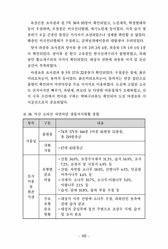 육상곤충 조사결과 총 7목 38과 85종이 확인되었고, 노린재목, 딱정벌레목 등이 우점하며, 우점종은 미국선녀벌레, 애기노린재 등이었다. 서측 습지 멸 종위기 Ⅱ급 곤충인 물장군 서식지가 조성되었으나 성체를 확인할 순 없었다. 해충인 미국선녀벌레가 우점하고, 갈색날개매미충의 대발생이 우려되었다. 양서·파충류 조사결과 양서류 총 1목 2과 2속 4종, 파충류 1목 1과 1속 1종 이 확인되었다. 양서류 중 한국 고유종인 한국산개구리가 출현하였고, 외래 종인 황소개구리의 서식이 확인되었다. 대상지 전반에 파충류 서식 및 은신 공간이 부족하였다. 야생조류 조사결과 총 5목 17과 22종류가 확인되었다. 우점종은 참새, 붉은 머리오목눈이, 물까치 등이었다. 붉은머리오목눈이, 물까치는 연중 집단으로 출현이 확인되어 ...