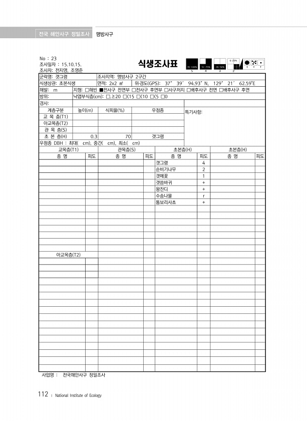 전국 해안사구 정밀조사 맹방사구 112 ? National Institute of Ecology No 23 조사일자 15.10.15. 조사자전지영, 조영준 식생조사표 군락명갯그령 조사지역맹방사구 2구간 식생상관초본식생 면적2x2 ㎡ 위?경도 GPS 37° 39′ 94.93″N, 129° 21′ 62.59E 해발m 지형□해빈 ■전사구 전면부 □전사구 후면부 □사구저지 □배후사구 전면 □배후사구 후면 방위낙엽부식층 cm □.≥20 □ 15 □ 10 □ 5 □0 경사계층구분 높이 m 식피율 % 우점종 특기사항교 목 층 T1 아교목층 T2 관 목 층 S 초 본 층 H 0.3 70 갯그령 우점종 DBH 최대 cm , 중간 cm , 최소 cm 교목층 T1 관목층 S 초본층 H 초본층 H 종 명 피도 종 명 피도 종 명...