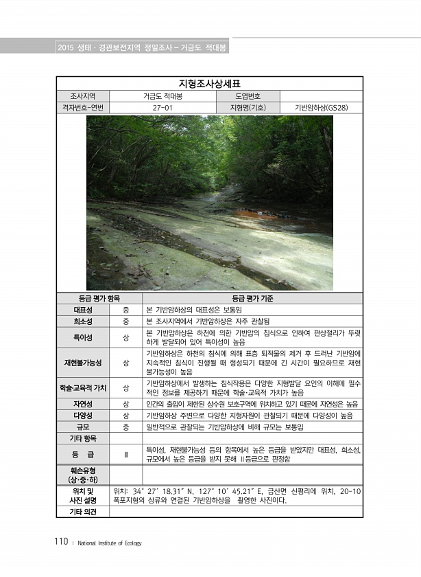 2015 생태·경관보전지역 정밀조사 거금도 적대봉 110 ? National Institute of Ecology 지형조사상세표 조사지역 거금도 적대봉 도엽번호 격자번호-연번 27-01 지형명 기호 기반암하상 GS28 등급 평가 항목 등급 평가 기준 대표성 중 본 기반암하상의 대표성은 보통임 희소성 중 본 조사지역에서 기반암하상은 자주 관찰됨 특이성 상 본 기반암하상은 하천에 의한 기반암의 침식으로 인하여 판상절리가 뚜렷 하게 발달되어 있어 특이성이 높음 재현불가능성 상 기반암하상은 하천의 침식에 의해 표층 퇴적물의 제거 후 드러난 기반암에 지속적인 침식이 진행될 때 형성되기 때문에 긴 시간이 필요하므로 재현 불가능성이 높음 학술?교육적 가치 상 기반암하상에서 발생하는 침식작용은 다양한 지형발달 요인의 이해...