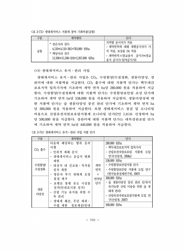 760 구분 계약행위 단가 CO2 흡수 다음에 해당하는 행위 등의 이행 인위적 재해 감시 생태계서비스 공급지 변화 제한 대상지 내 건조물·적치물 설치 제한 방문자 투기 생태계 오염 물질 제거 보행로 통행 유도 시설물 설치 안내표시물 설치 산림 기능 유지를 위한 수 목 관리 생태계 훼손, 무단 채취· 수렵 제한 정보제공 안내 계약 면적 × 면적당 단가 280,000 원/ha 백두대간보호지역 입목가치 산림유전자원보호림 지불제 도입 연구 산림청, 2008a 수원함양/ 수질정화 538,000 원/ha 수원함양보안림지불 단가 수원함양보안림 지불제 도입 연구 한국농촌경제연구원, 2007 생물 다양성 300,000 원/ha 숲 생물다양성 증진 관리 단가 지 속가능한 산림 이용을 위한 숲 생 태계 관리 산림유전자원보호림지...