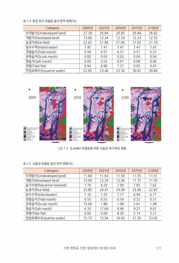 기후 변화로 인한 생태계의 현재와 미래 121 그림 7.9 SLAMM 모델링에 의한 낙동강 하구역의 변화. 2009 2050 2100 표 7.4 한강 하구 모델링 결과 면적 변화 % 표 7.5 낙동강 모델링 결과 면적 변화 % Category 2009년 2025년 2050년 2075년 2100년 미개발지 Undeveloped land 27.28 26.84 26.85 26.84 26.82 개발지 Developed land 13.06 12.34 12.34 12.33 12.32 농경지 Rice field 22.62 21.86 21.84 21.82 21.79 담수수역 Inland water 7.45 7.47 7.47 7.47 7.47 갯벌습지 Tidal marsh 0.59 0.57 0.57 0.57 0.57 관목습...