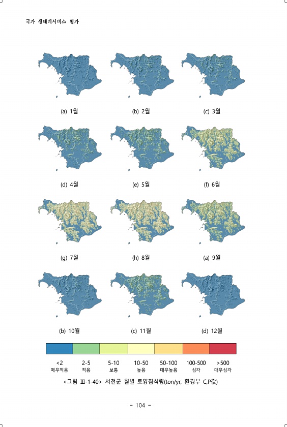 국가 생태계서비스 평가 104 a 1월 b 2월 c 3월 d 4월 e 5월 f 6월 g 7월 h 8월 a 9월 b 10월 c 11월 d 12월 2 2-5 5-10 10-50 50-100 100-500 500 매우적음 적음 보통 높음 매우높음 심각 매우심각 그림 Ⅲ-1-40 서천군 월별 토양침식량 ton/yr, 환경부 C,P값