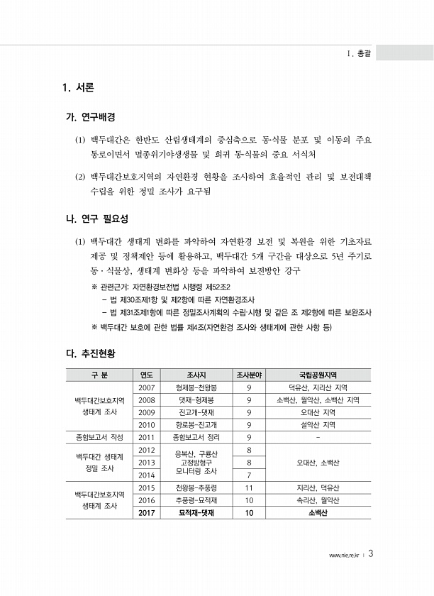 Ⅰ. 총괄 www.nie.re.kr ? 3 1. 서론 가. 연구배경 1 백두대간은 한반도 산림생태계의 중심축으로 동?식물 분포 및 이동의 주요 통로이면서 멸종위기야생생물 및 희귀 동?식물의 중요 서식처 2 백두대간보호지역의 자연환경 현황을 조사하여 효율적인 관리 및 보전대책 수립을 위한 정밀 조사가 요구됨 나. 연구 필요성 1 백두대간 생태계 변화를 파악하여 자연환경 보전 및 복원을 위한 기초자료 제공 및 정책제안 등에 활용하고, 백두대간 5개 구간을 대상으로 5년 주기로 동·식물상, 생태계 변화상 등을 파악하여 보전방안 강구 ※ 관련근거자연환경보전법 시행령 제52조2 법 제30조제1항 및 제2항에 따른 자연환경조사 법 제31조제1항에 따른 정밀조사계획의 수립·시행 및 같은 조 제2항에 따른 보완조사 ※ 백...