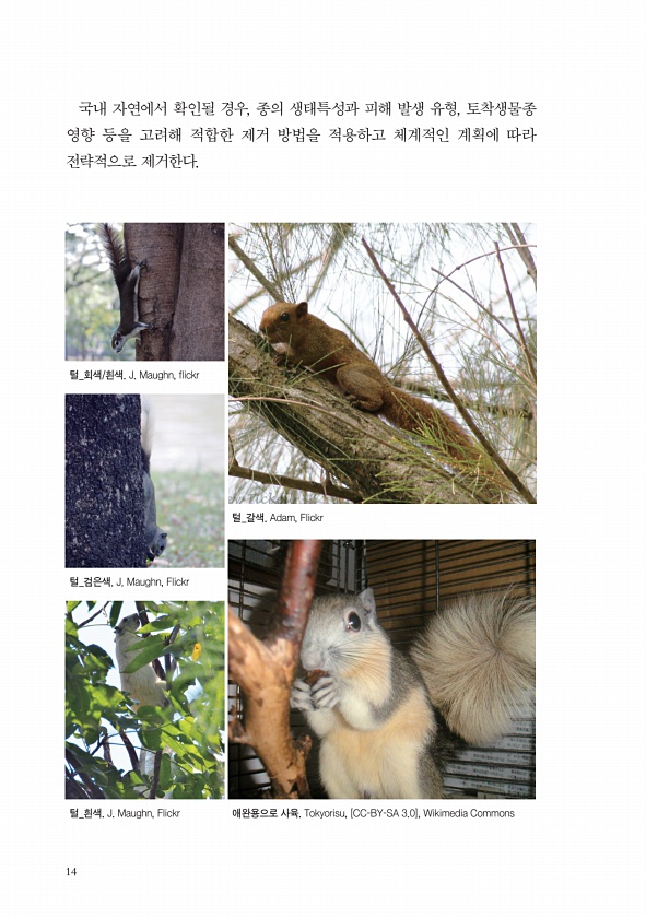 14 털_회색/흰색. J. Maughn, flickr 털_갈색. Adam, Flickr 애완용으로 사육. Tokyorisu, [CC-BY-SA 3.0], Wikimedia Commons 털_검은색. J. Maughn, Flickr 털_흰색. J. Maughn, Flickr 국내 자연에서 확인될 경우, 종의 생태특성과 피해 발생 유형, 토착생물종 영향 등을 고려해 적합한 제거 방법을 적용하고 체계적인 계획에 따라 전략적으로제거한다.
