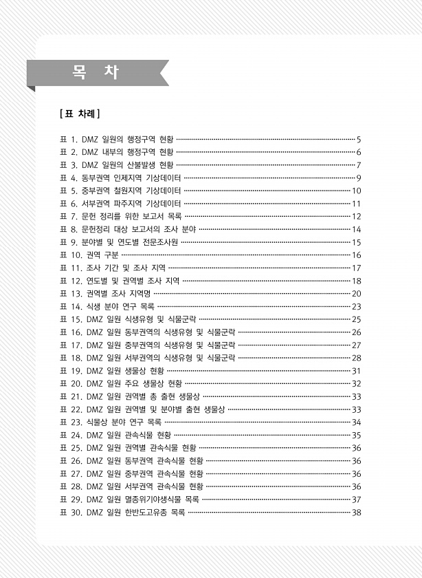 목 차 [ 표 차례 ] 표 1. DMZ 일원의 행정구역 현황 ···························································································5 표 2. DMZ 내부의 행정구역 현황 ···························································································6 표 3. DMZ 일원의 산불발생 현황 ···························································································7 표 4. 동부권역 인제지역 기상데이터 ························...