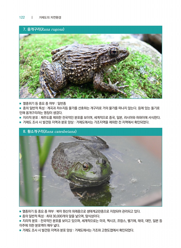 122 ┃ 거제도의 자연환경 7. 옴개구리 Rana rugosa 8. 황소개구리 Rana catesbeiana ■ 멸종위기 등 중요 종 여부 일반종 ■ 종의 일반적 특성 계곡과 저수지등 물가를 선호하는 개구리로 거의 물가를 떠나지 않는다. 등에 있는 돌기로 인해 옴개구리라는 명칭이 생겼다. ■ 지리적 분포 제주도를 제외한 전국적인 분포를 보이며, 세계적으로 중국, 일본, 러시아와 하와이에 서식한다. ■ 거제도 조사 시 발견된 지역과 분포 양상 거제도에서는 가조지역을 제외한 전 지역에서 확인되었다. ■ 멸종위기 등 중요 종 여부 북미 원산의 외래종으로 생태계교란종으로 지정되어 관리되고 있다. ■ 종의 일반적 특성 최대 30,000개의 알을 낳으며, 탐식성이다. ■ 지리적 분포 전국적인 분포를 보이고 있으며, ...