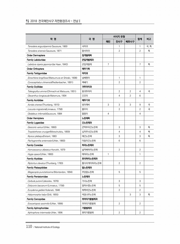 2018 전국해안사구 자연환경조사 전남Ⅰ 110 ? National Institute of Ecology 학 명 국 명 서식지 유형 합계 비고 해빈 전사구 배후사구 Tenodera angustipennis Saussure, 1869 사마귀 1 1 국, 특 Tenodera sinensis Saussure, 1871 왕사마귀 2 2 특 Order Dermaptera 집게벌레목 Family Labiduridae 큰집게벌레과 Labidura riparia japonica de Haan, 1842 큰집게벌레 7 7 특 Order Orthoptera 메뚜기목 Family Tettigoniidae 여치과 Sinochlora longifissa Matsumura et Shiraki, 1908 날베짱이 1 1 Conocep...