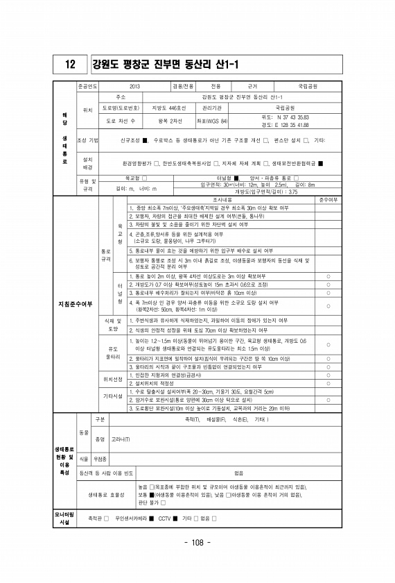 108 12 강원도 평창군 진부면 동산리 산1-1 해 당 생 태 통 로 준공연도 2013 겸용/전용 전용 근거 국립공원 위치 주소 강원도 평창군 진부면 동산리 산1-1 도로명 도로번호 지방도 446호선 관리기관 국립공원 도로 차선 수 왕복 2차선 좌표 WGS 84 위도N 37 43 35.83 경도E 128 35 41.88 조성 기법 신규조성 ■, 수로박스 등 생태통로가 아닌 기존 구조물 개선 □, 펜스만 설치 □, 기타설치 배경 환경영향평가 □, 한반도생태축복원사업 □, 지자체 자체 계획 □, 생태보전반환협력금 ■ 유형 및 규격 육교형 □ 터널형 ■, 양서?파충류 통로 □ 길이m, 너비m 입구면적30㎡ 너비12m, 높이 2.5m , 길이8m 개방도 입구면적/길이 3.75 지침준수여부 통로 규격 육 교 형 조...