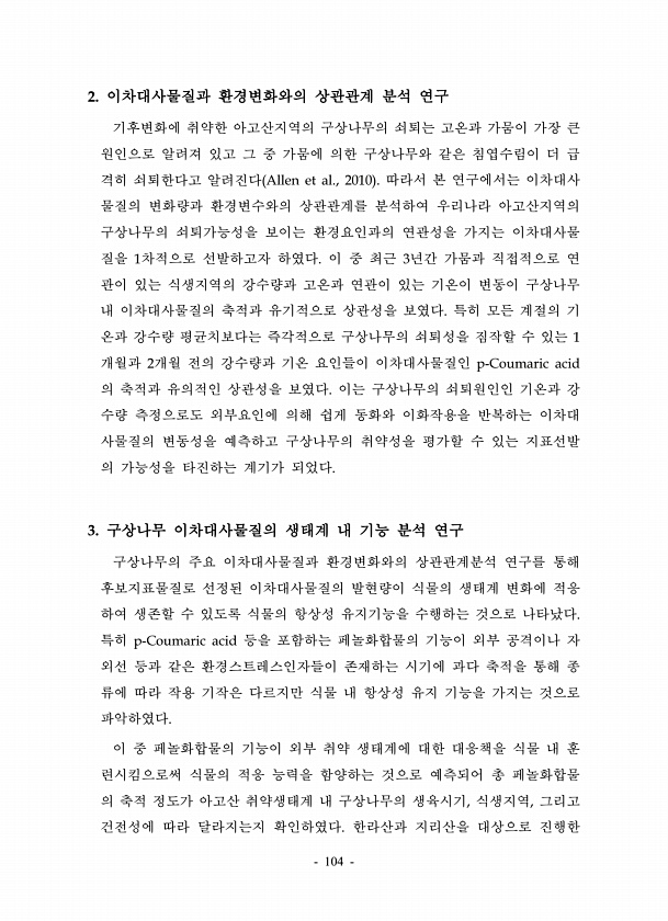 104 2. 이차대사물질과 환경변화와의 상관관계 분석 연구 기후변화에 취약한 아고산지역의 구상나무의 쇠퇴는 고온과 가뭄이 가장 큰 원인으로 알려져 있고 그 중 가뭄에 의한 구상나무와 같은 침엽수림이 더 급 격히 쇠퇴한다고 알려진다 Allen et al., 2010 따라서 본 연구에서는 이차대사 물질의 변화량과 환경변수와의 상관관계를 분석하여 우리나라 아고산지역의 구상나무의 쇠퇴가능성을 보이는 환경요인과의 연관성을 가지는 이차대사물 질을 1차적으로 선발하고자 하였다. 이 중 최근 3년간 가뭄과 직접적으로 연 관이 있는 식생지역의 강수량과 고온과 연관이 있는 기온이 변동이 구상나무 내 이차대사물질의 축적과 유기적으로 상관성을 보였다. 특히 모든 계절의 기 온과 강수량 평균치보다는 즉각적으로 구상나무의 쇠퇴성을 ...
