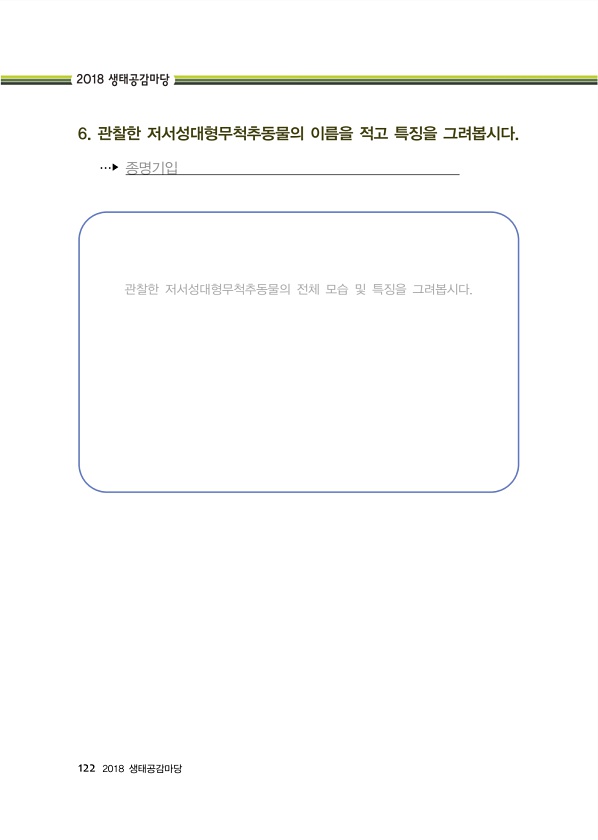 122 2018 생태공감마당 6. 관찰한 저서성대형무척추동물의 이름을 적고 특징을 그려봅시다. …? 종명기입 관찰한 저서성대형무척추동물의 전체 모습 및 특징을그려봅시다.