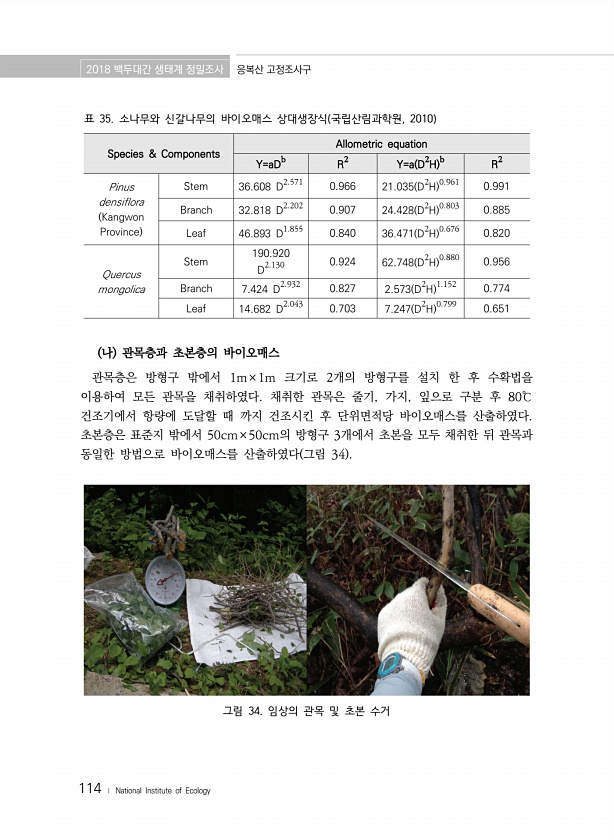 2018 백두대간 생태계 정밀조사 응복산 고정조사구 114 ? National Institute of Ecology Species & Components Allometric equation Y=aDb R2 Y=a D2H b R2 Pinus densiflora Kangwon Province Stem 36.608 D2.571 0.966 21.035 D2H 0.961 0.991 Branch 32.818 D2.202 0.907 24.428 D2H 0.803 0.885 Leaf 46.893 D1.855 0.840 36.471 D2H 0.676 0.820 Quercus mongolica Stem 190.920 D2.130 0.924 62.748 D2H 0.880 0.956 Branch 7.424 D2.932 0.827...