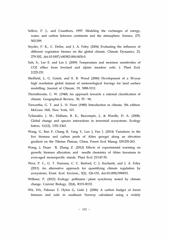 102 Sellers, P. J., and Coauthors, 1997Modeling the exchanges of energy, water, and carbon between continents and the atmosphere. Science, 275, 502-509. Snyder, P. K., C. Delire, and J. A. Foley 2004 Evaluating the influence of different vegetation biomes on the global climate. Climate Dynamics, 23, 279-302, doi10.1007/s00382-004-0430-0. Suh, S., Lee E. and Lee J. 2009 Temperature and moisture sen...