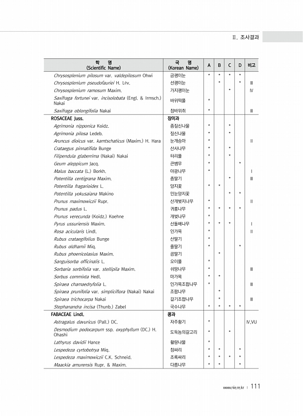Ⅱ. 조사결과 www.nie.re.kr ? 111 학 명 Scientific Name 국 명 Korean Name A B C D 비고 Chrysosplenium pilosum var. valdepilosum Ohwi 금괭이눈 * * * * Chrysosplenium pseudofauriei H. L?v. 선괭이눈 * * Ⅲ Chrysosplenium ramosum Maxim. 가지괭이눈 * Ⅳ Saxifraga fortunei var. incisolobata Engl. & Irmsch. Nakai 바위떡풀 * Saxifraga oblongifolia Nakai 참바위취 * Ⅲ ROSACEAE Juss. 장미과 Agrimonia nipponica Koidz. 좀짚신나물 * * Agrimonia pilosa L...