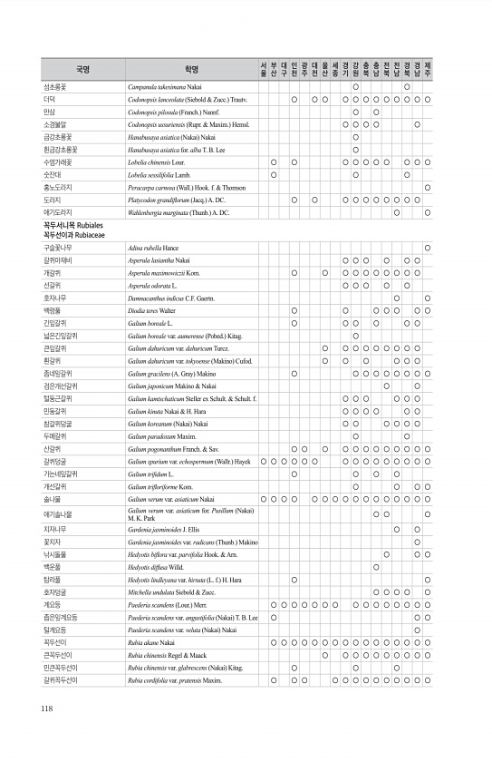 118 섬초롱꽃 Campanula takesimana Nakai ○ ○ 더덕 Codonopsis lanceolata Siebold & Zucc. Trautv. ○ ○ ○ ○ ○ ○ ○ ○ ○ ○ ○ ○ 만삼 Codonopsis pilosula Franch. Nannf. ○ ○ 소경불알 Codonopsis ussuriensis Rupr. & Maxim. Hemsl. ○ ○ ○ ○ ○ 금강초롱꽃 Hanabusaya asiatica Nakai Nakai ○ 흰금강초롱꽃 Hanabusaya asiatica for. alba T. B. Lee ○ 수염가래꽃 Lobelia chinensis Lour. ○ ○ ○ ○ ○ ○ ○ ○ ○ ○ 숫잔대 Lobelia sessilifolia Lamb. ○ ○ ○ 홍노도라지 Per...