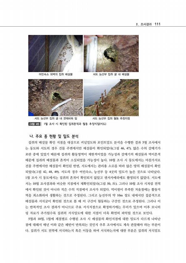 Ⅱ. 조사결과 111 어민숙소 외벽의 집쥐 배설물 서도 능선부 집쥐 굴 내 배설물 서도 능선부 집쥐 굴 내 갯제비쑥 잎 서도 능선부 집쥐 월동 추정지점 그림 45 1월 조사 시 확인된 집쥐흔적과 월동 추정지점 서도 나. 주요 종 현황 및 밀도 분석 집쥐의 배설물 확인 지점을 대상으로 커널밀도와 포인트밀도 분석을 수행한 결과 5월 조사에서 는 동도와 서도의 경우 건물 주변에서만 배설물이 확인되었다 그림 46, 47 많은 수의 갈매기가 포란 중에 있었기 때문에 집쥐의 활동영역이 제한적이었을 가능성과 갈매기의 배설물과 먹이흔적 때문에 집쥐의 배설물과 흔적이 소실되었을 가능성이 높다. 10월 조사 시 동도에서는 마찬가지로 건물 주변에서만 배설물이 확인된 반면, 서도에서는 관리용 소로를 따라 많은 양의 배설물이 확인...