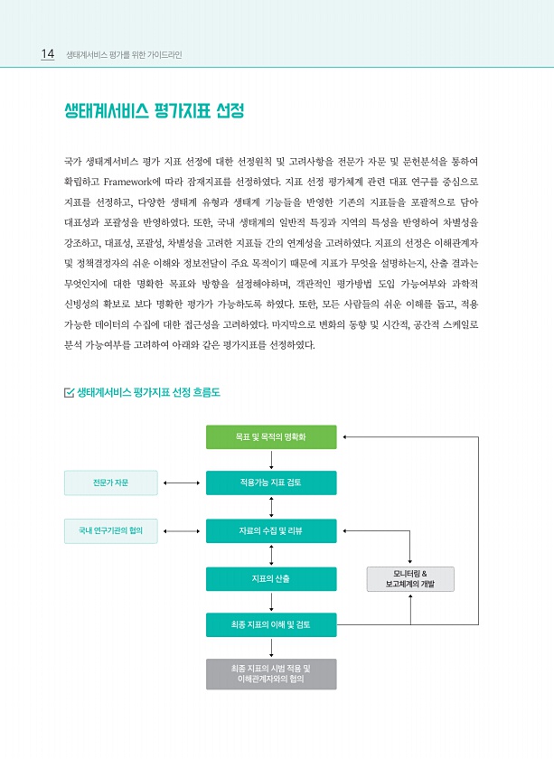 14 생태계서비스 평가를 위한 가이드라인 생태계서비스 평가지표 선정 국가 생태계서비스 평가 지표 선정에 대한 선정원칙 및 고려사항을 전문가 자문 및 문헌분석을 통하여 확립하고 Framework에 따라 잠재지표를 선정하였다. 지표 선정 평가체계 관련 대표 연구를 중심으로 지표를 선정하고, 다양한 생태계 유형과 생태계 기능들을 반영한 기존의 지표들을 포괄적으로 담아 대표성과 포괄성을 반영하였다. 또한, 국내 생태계의 일반적 특징과 지역의 특성을 반영하여 차별성을 강조하고, 대표성, 포괄성, 차별성을 고려한 지표들 간의 연계성을 고려하였다. 지표의 선정은 이해관계자 및 정책결정자의 쉬운 이해와 정보전달이 주요 목적이기 때문에 지표가 무엇을 설명하는지, 산출 결과는 무엇인지에 대한 명확한 목표와 방향을 설정해야하며...