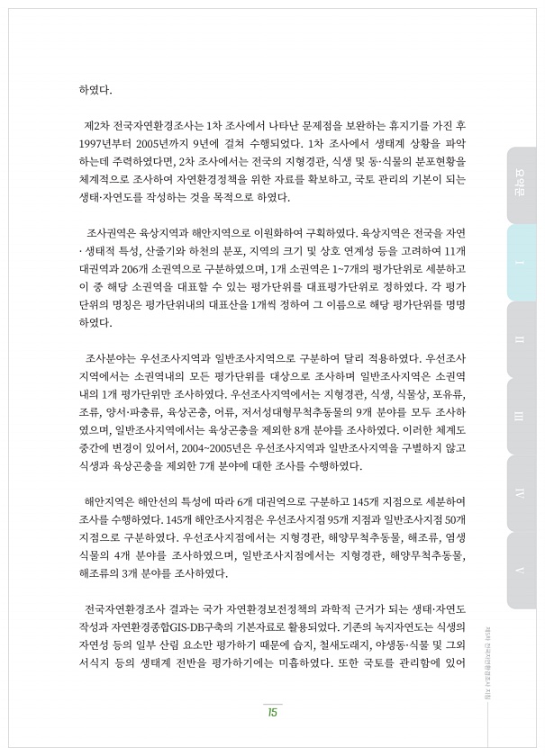 15 제5차 전국자연환경조사 지침 하였다. 제?차?전국자연환경조사는 ?차?조사에서?나타난?문제점을?보완하는?휴지기를?가진?후 ????년부터 ????년까지 ?년에? 걸쳐? 수행되었다. ?차? 조사에서? 생태계? 상황을? 파악 하는데?주력하였다면, ?차?조사에서는?전국의?지형경관, 식생?및?동·식물의?분포현황을 체계적으로?조사하여?자연환경정책을?위한?자료를?확보하고, 국토?관리의?기본이?되는 생태·자연도를?작성하는?것을?목적으로?하였다. 조사권역은?육상지역과?해안지역으로?이원화하여?구획하였다. 육상지역은?전국을?자연 · 생태적?특성, 산줄기와?하천의?분포, 지역의?크기?및?상호?연계성?등을?고려하여 ??개 대권역과 ???개?소권역으로?구분하였으며, ?개?소권역은 ??개의?평가단위로?세분하고 이?중?해당?소권역을...