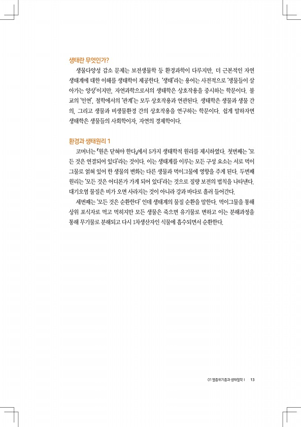 01 멸종위기종과 생태철학Ⅰ 13 생태란 무엇인가? 생물다양성 감소 문제는 보전생물학 등 환경과학이 다루지만, 더 근본적인 자연 생태계에 대한 이해를 생태학이 제공한다. ‘생태’라는 용어는 사전적으로 ‘생물들이 살 아가는 양상’이지만, 자연과학으로서의 생태학은 상호작용을 중시하는 학문이다. 불 교의 ‘인연’, 철학에서의 ‘관계’는 모두 상호작용과 연관된다. 생태학은 생물과 생물 간 의, 그리고 생물과 비생물환경 간의 상호작용을 연구하는 학문이다. 쉽게 말하자면 생태학은 생물들의 사회학이자, 자연의 경제학이다. 환경과 생태원리 1 코머너는 『원은 닫혀야 한다』에서 5가지 생태학적 원리를 제시하였다. 첫번째는 ‘모 든 것은 연결되어 있다’라는 것이다. 이는 생태계를 이루는 모든 구성 요소는 서로 먹이 그물로 얽...