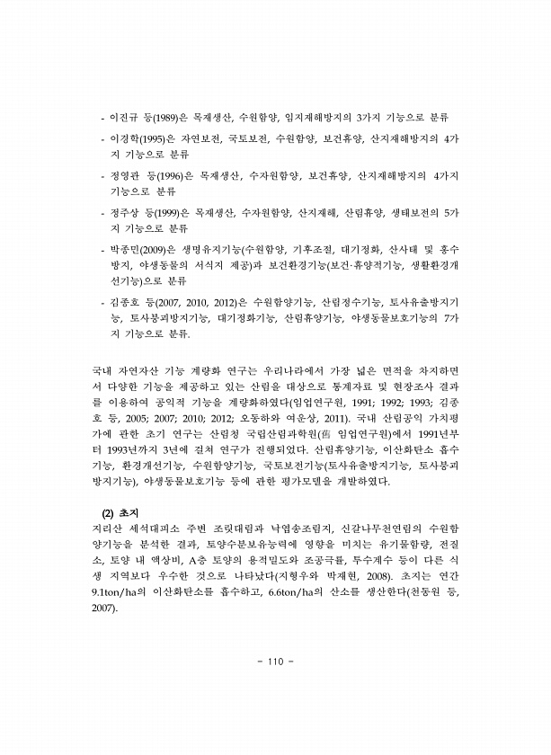 110 이진규 등 은 목재생산 수원함양 임지재해방지의 가지 기능으로 분류 이경학 은 자연보전 국토보전 수원함양 보건휴양 산지재해방지의 가 지 기능으로 분류 정영관 등 은 목재생산 수자원함양 보건휴양 산지재해방지의 가지 기능으로 분류 정주상 등 은 목재생산 수자원함양 산지재해 산림휴양 생태보전의 가 지 기능으로 분류 박종민 은 생명유지기능 수원함양 기후조절 대기정화 산사태 및 홍수 방지 야생동물의 서식지 제공 과 보건환경기능 보건 휴양적기능 생활환경개 선기능 으로 분류 김종호 등 은 수원함양기능 산림정수기능 토사유출방지기 능 토사붕괴방지기능 대기정화기능 산림휴양기능 야생동물보호기능의 가 지 기능으로 분류 국내 자연자산 기능 계량화 연구는 우리나라에서 가장 넓은 면적을 차지하면 서 다양한 기능을 제공하고 있는 ...