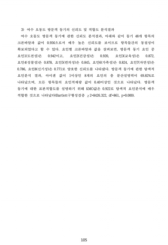 105 3 여수 오동도 방문객 동기의 신뢰도 및 적합도 분석결과 여수 오동도 방문객 동기에 관한 신뢰도 분석결과, 아래와 같이 동기 48개 항목의 크론바알파 값이 0.956으로서 매우 높은 신뢰도를 보이므로 항목들간의 동질성이 확보되었다고 할 수 있다. 요인별 크론바알파 값을 살펴보면, 방문객 동기 요인 중 요인1 도전성 은 0.942이고, 요인2 건강성 은 0.920, 요인3 교육성 은 0.872, 요인4 성찰성 은 0.878, 요인5 편의성 은 0.845, 요인6 가족성 은 0.824, 요인7 자연성 은 0.786, 요인8 신기성 은 0.771로 양호한 신뢰도를 나타냈다. 방문객 동기에 관한 탐색적 요인분석 결과, 아이겐 값이 1이상인 8개의 요인의 총 분산설명력이 69.82%로 나타났으며, 모든 항목들...