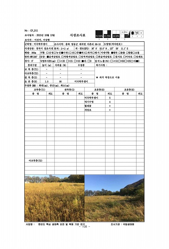 108 No CP_D11 조사일자 2015년 10월 13일 조사자 이선미, 서상령 식생조사표 군락명미국쑥부쟁이 조사지역충북 영동군 매곡면 어촌리 68-10 도엽명 격자번호 식생상관경작지 잡초식생 면적2×2 ㎡ 위·경도 GPS 36°8′ 52.0″N , 127° 59′ 11.1″E 해발360m 지형□산정□능선■사면 □상□중■하 □계곡□평지 미세지형■평면 □돌출 □함몰□요철 방위NW 330° 토양■갈색삼림토 □적황색삼림토 □암적색삼림토 □회갈색삼림토 □침식토 □미숙토 □암쇄토 경사9° 낙엽부식층 cm □≥20 □ 15 □ 10 ■ 5 □0 암석노 출 % □≥51□ 50□ 25□ 5■0 층위구분 높이 m 식피율 % 우점종 특기사항 교 목 층 T1 ※ 과거 목장으로 이용 아교목층 T2 관 목 층 S 초 본 층 H ...