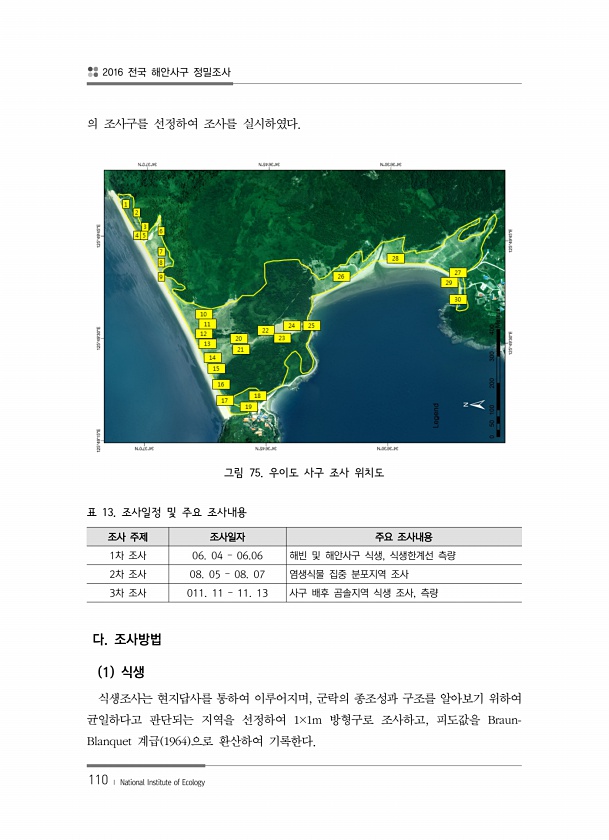 2016 전국 해안사구 정밀조사 110 ? National Institute of Ecology 의 조사구를 선정하여 조사를 실시하였다. 그림 75. 우이도 사구 조사 위치도 조사 주제 조사일자 주요 조사내용 1차 조사 06. 04 ? 06.06 해빈 및 해안사구 식생, 식생한계선 측량 2차 조사 08. 05 ? 08. 07 염생식물 집중 분포지역 조사 3차 조사 011. 11 ? 11. 13 사구 배후 곰솔지역 식생 조사, 측량 표 13. 조사일정 및 주요 조사내용 다. 조사방법 1 식생 식생조사는 현지답사를 통하여 이루어지며, 군락의 종조성과 구조를 알아보기 위하여 균일하다고 판단되는 지역을 선정하여 1×1m 방형구로 조사하고, 피도값을 BraunBlanquet 계급 1964 으로 환산하여기록한다.