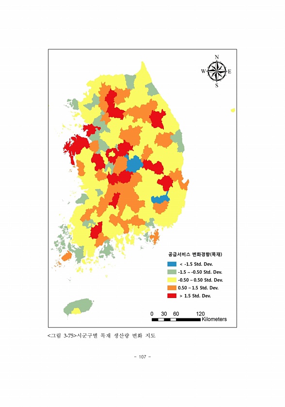 107 그림 3-75 시군구별 목재 생산량 변화지도
