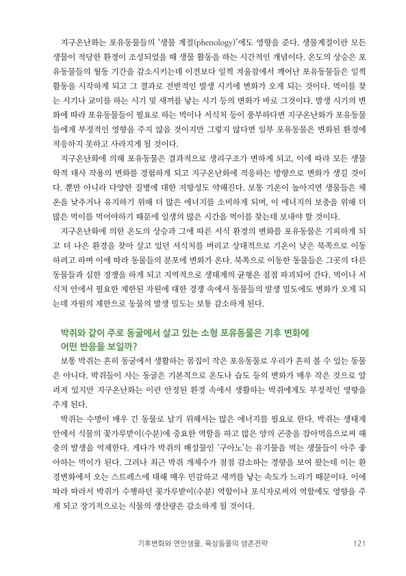 기후변화와 연안생물, 육상동물의 생존전략 121 지구온난화는 포유동물들의 ‘생물 계절 phenology ’에도 영향을 준다. 생물계절이란 모든 생물이 적당한 환경이 조성되었을 때 생물 활동을 하는 시간적인 개념이다. 온도의 상승은 포 유동물들의 월동 기간을 감소시키는데 이전보다 일찍 겨울잠에서 깨어난 포유동물들은 일찍 활동을 시작하게 되고 그 결과로 전반적인 발생 시기에 변화가 오게 되는 것이다. 먹이를 찾 는 시기나 교미를 하는 시기 및 새끼를 낳는 시기 등의 변화가 바로 그것이다. 발생 시기의 변 화에 따라 포유동물들이 필요로 하는 먹이나 서식처 등이 풍부하다면 지구온난화가 포유동물 들에게 부정적인 영향을 주지 않을 것이지만 그렇지 않다면 일부 포유동물은 변화된 환경에 적응하지 못하고 사라지게 될 것이다...