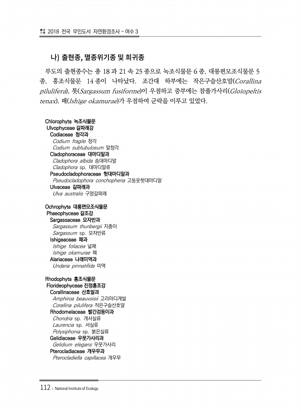2018 전국 무인도서 자연환경조사 여수 3 112 ? National Institute of Ecology , 부도의 출현종수는 총 18 과 21 속 25 종으로 녹조식물문 6 종, 대롱편모조식물문 5 종, 홍조식물문 14 종이 나타났다. 조간대 하부에는 작은구슬산호말 Corallina pilulifera , 톳 Sargassum fusiforme 이 우점하고 중부에는 참풀가사리 Gloiopeltis tenax , 패 Ishige okamurae 가 우점하여 군락을 이루고 있었다. Chlorophyta 녹조식물문 Ulvophyceae 갈파래강 Codiaceae 청각과 Codium fragile 청각 Codium subtubulosum 말청각 Cladophoraceae 대마디말과 Cladophora albi...