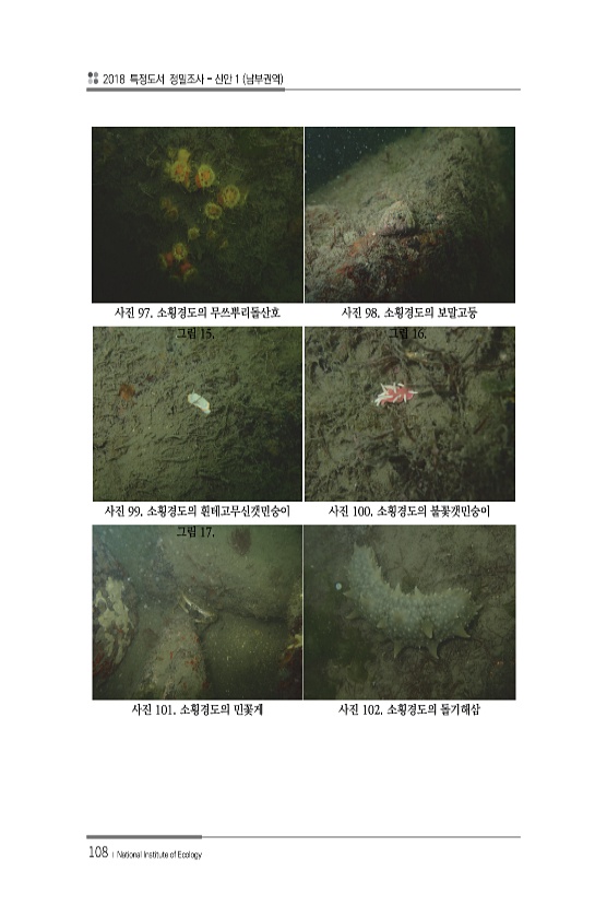 2018 특정도서 정밀조사 신안 1 남부권역 108 ? National Institute of Ecology 사진 97. 소횡경도의 무쓰뿌리돌산호 사진 98. 소횡경도의 보말고둥 그림 15. 그림 16. 사진 99. 소횡경도의 흰테고무신갯민숭이 사진 100. 소횡경도의 불꽃갯민숭이 그림 17. 사진 101. 소횡경도의 민꽃게 사진 102. 소횡경도의돌기해삼