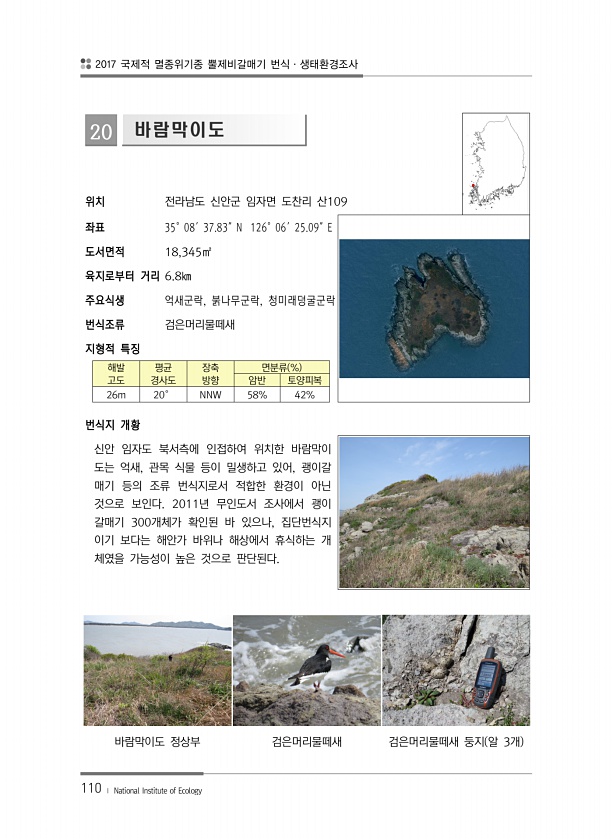 2017 국제적 멸종위기종 뿔제비갈매기 번식·생태환경조사 110 ? National Institute of Ecology 20 바람막이도 위치 전라남도 신안군 임자면 도찬리 산109 좌표 35°08′37.83″N 126°06′25.09″E 도서면적 18,345㎡ 육지로부터 거리 6.8㎞ 주요식생 억새군락, 붉나무군락, 청미래덩굴군락 번식조류 검은머리물떼새 지형적 특징 해발 고도 평균 경사도 장축 방향 면분류 % 암반 토양피복 26m 20° NNW 58% 42% 번식지 개황 신안 임자도 북서측에 인접하여 위치한 바람막이 도는 억새, 관목 식물 등이 밀생하고 있어, 괭이갈 매기 등의 조류 번식지로서 적합한 환경이 아닌 것으로 보인다. 2011년 무인도서 조사에서 괭이 갈매기 300개체가 확인된 바 있으나, 집단...