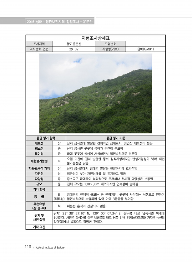 2015 생태·경관보전지역 정밀조사 운문산 110 ? National Institute of Ecology 지형조사상세표 조사지역 청도 운문산 도엽번호 격자번호-연번 29-02 지형명 기호 급애 GM01 등급 평가 항목 등급 평가 기준 대표성 상 산지 급사면에 발달한 전형적인 급애로서, 성인상 대표성이 높음 희소성 중 산지 급사면 곳곳에 급애가 간간히 분포함 특이성 중 급애 곳곳에 식생이 서식하면서 불연속적으로 분포함 재현불가능성 하 오랜 기간에 걸쳐 발달한 풍화 침식지형이지만 변형가능성이 낮아 재현 불가능성은 낮음 학술?교육적 가치 상 산지 급사면에서 급애의 발달을 관찰하기에 효과적임 자연성 상 접근성이 낮아 자연상태를 잘 유지하고 있음 다양성 중 중소규모 급애들이 복합적으로 존재하나 전체적 다양성은 보통...