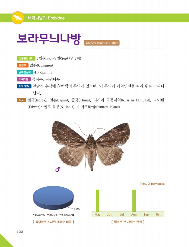 122 태극나방과 Erebidae 성충출현시기 5월 May 9월 Sep 연 2회 풍부도 많음 Common 날개편길이 4155mm 먹이식물 등나무, 자귀나무 대표 형질 앞날개 후각에 청백색의 무늬가 있으며, 이 무늬가 아외연선을 따라 위로도 나타 난다. 분포 전국 Korea , 일본 Japan , 중국 China , 러시아 극동지역 Russian Far East , 타이완 Taiwan 인도 북부 N. India , 수마트라섬 Sumatra Island 보라무늬나방 Ercheia umbrosa Butler 【 월별로 본 개체수 변화 】 Total2 individuals May Jun Jul Aug Sep Oct 【 식생별로 조사된 개체수 비율 】 100% 신갈나무림 소나무림아까시나무림