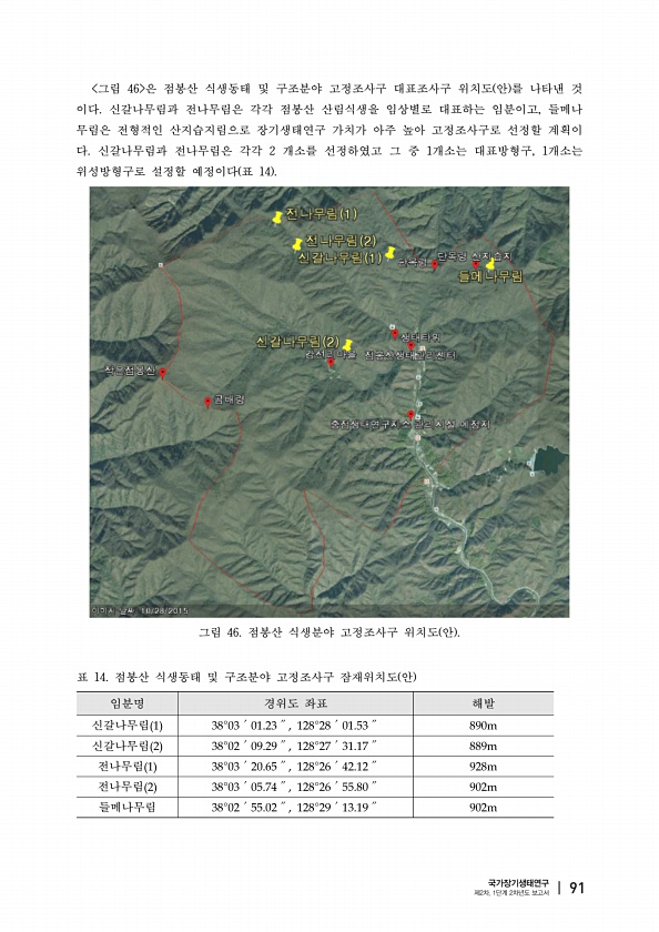 임분명 경위도 좌표 해발 신갈나무림 신갈나무림 전나무림 전나무림 들메나무림 표 14. 점봉산 식생동태 및 구조분야 고정조사구 잠재위치도 안 그림 46 은 점봉산 식생동태 및 구조분야 고정조사구 대표조사구 위치도 안 를 나타낸 것 이다. 신갈나무림과 전나무림은 각각 점봉산 산림식생을 임상별로 대표하는 임분이고, 들메나 무림은 전형적인 산지습지림으로 장기생태연구 가치가 아주 높아 고정조사구로 선정할 계획이 다. 신갈나무림과 전나무림은 각각 2 개소를 선정하였고 그 중 1개소는 대표방형구, 1개소는 위성방형구로 설정할 예정이다 표 14 그림 46. 점봉산 식생분야 고정조사구 위치도 안 국가장기생태연구 제2차, 1단계 2차년도 보고서 |91