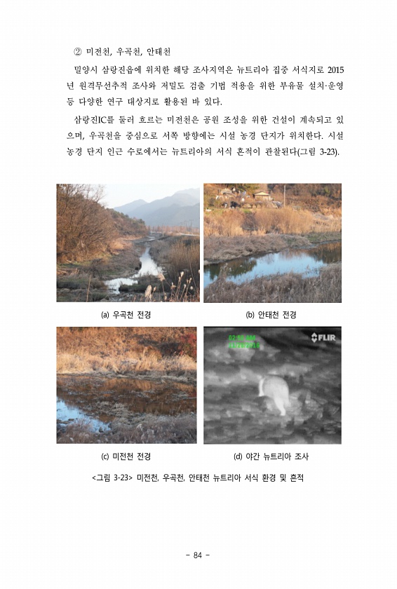 ② 미전천, 우곡천, 안태천 밀양시 삼랑진읍에 위치한 해당 조사지역은 뉴트리아 집중 서식지로 2015 년 원격무선추적 조사와 저밀도 검출 기법 적용을 위한 부유물 설치·운영 등 다양한 연구 대상지로 활용된 바 있다. 삼랑진IC를 둘러 흐르는 미전천은 공원 조성을 위한 건설이 계속되고 있 으며, 우곡천을 중심으로 서쪽 방향에는 시설 농경 단지가 위치한다. 시설 농경 단지 인근 수로에서는 뉴트리아의 서식 흔적이 관찰된다 그림 3-23 ? ? ? ? ?? ? ? ?? ? ?? ? ? ? ??