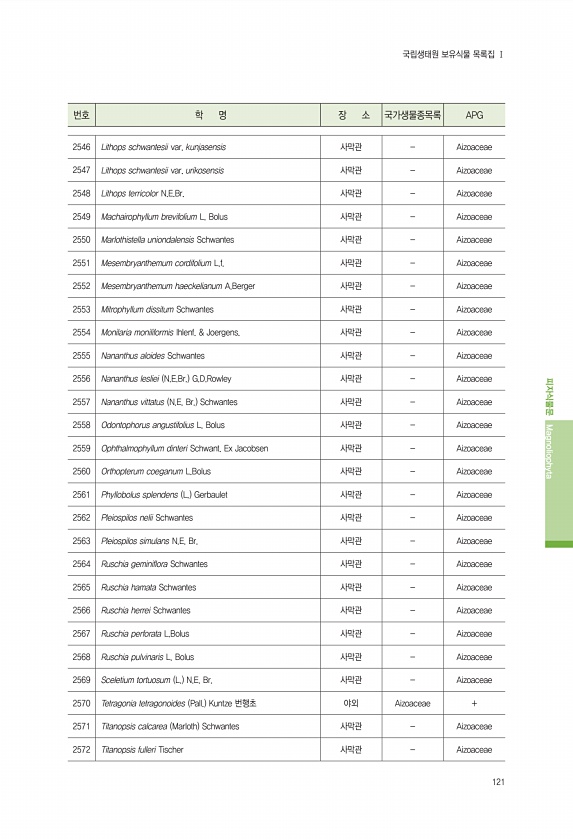121 번호 학 명 장 소 국가생물종목록 APG 피자식물문 Magnoliophyta 국립생태원 보유식물 목록집 Ⅰ 2546 Lithops schwantesii var. kunjasensis 사막관 Aizoaceae 2547 Lithops schwantesii var. urikosensis 사막관 Aizoaceae 2548 Lithops terricolor N.E.Br. 사막관 Aizoaceae 2549 Machairophyllum brevifolium L. Bolus 사막관 Aizoaceae 2550 Marlothistella uniondalensis Schwantes 사막관 Aizoaceae 2551 Mesembryanthemum cordifolium L.f. 사막관 Aizoaceae 2552 Mesemb...