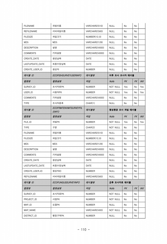 110 FILENAME 파일이름 VARCHAR2 510 NULL No No REFILENAME 서버파일이름 VARCHAR2 560 NULL No No FILESIZE 파일크기 NUMBER 12,0 NULL No No MD5 MD5 VARCHAR2 128 NULL No No DESCRIPTION 설명 VARCHAR2 4000 NULL No No COMMENTS 기타설명 VARCHAR2 4000 NULL No No CREATE_DATE 생성날짜 DATE NULL No No LASTUPDATE_DATE 최종수정날짜 DATE NULL No No CREATE_USER_ID 생성자 NUMBER NULL No No 테이블 ID ECOFISHSURVEYUSERINFO 테이블명 어류 조사 조사자 테이블 컬럼명 컬럼설명 타입...