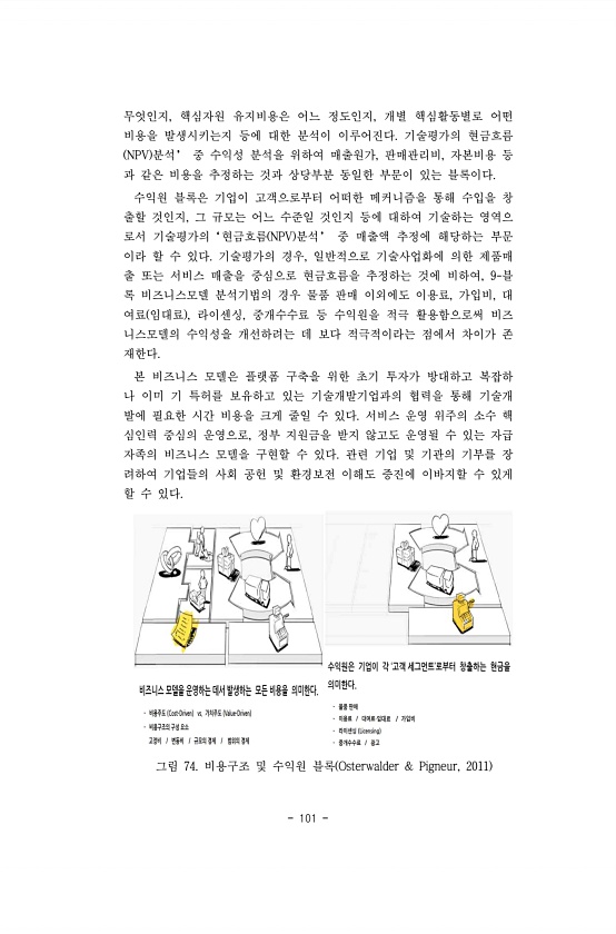 101 무엇인지, 핵심자원 유지비용은 어느 정도인지, 개별 핵심활동별로 어떤 비용을 발생시키는지 등에 대한 분석이 이루어진다. 기술평가의 현금흐름 NPV 분석’ 중 수익성 분석을 위하여 매출원가, 판매관리비, 자본비용 등 과 같은 비용을 추정하는 것과 상당부분 동일한 부문이 있는 블록이다. 수익원 블록은 기업이 고객으로부터 어떠한 메커니즘을 통해 수입을 창 출할 것인지, 그 규모는 어느 수준일 것인지 등에 대하여 기술하는 영역으 로서 기술평가의‘현금흐름 NPV 분석’ 중 매출액 추정에 해당하는 부문 이라 할 수 있다. 기술평가의 경우, 일반적으로 기술사업화에 의한 제품매 출 또는 서비스 매출을 중심으로 현금흐름을 추정하는 것에 비하여, 9-블 록 비즈니스모델 분석기법의 경우 물품 판매 이외에도 이용료, 가입...