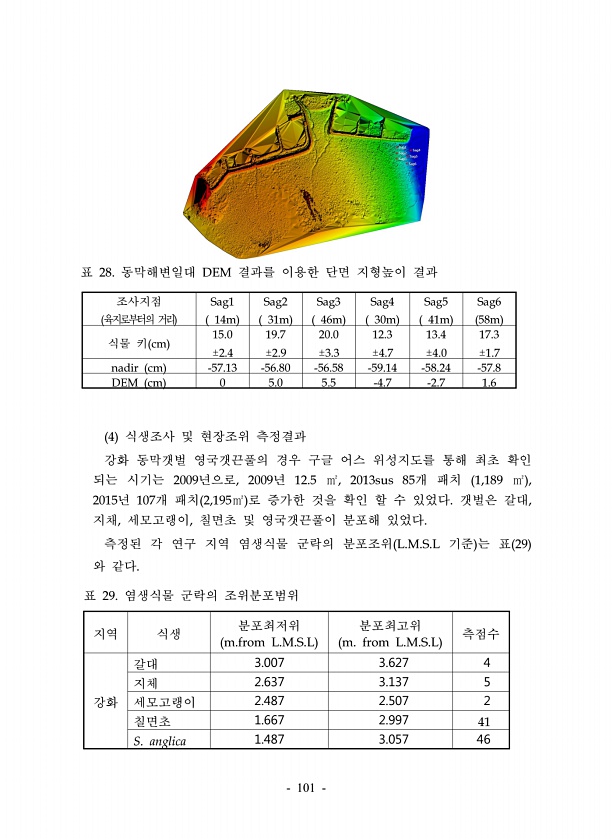 101 표 28. 동막해변일대 DEM 결과를 이용한 단면 지형높이 결과 조사지점 육지로부터의 거리 Sag1 14m Sag2 31m Sag3 46m Sag4 30m Sag5 41m Sag6 58m 식물 키 cm 15.0 ±2.4 19.7 ±2.9 20.0 ±3.3 12.3 ±4.7 13.4 ±4.0 17.3 ±1.7 nadir cm -57.13 -56.80 -56.58 -59.14 -58.24 -57.8 DEM cm 0 5.0 5.5 -4.7 -2.7 1.6 4 식생조사 및 현장조위 측정결과 강화 동막갯벌 영국갯끈풀의 경우 구글 어스 위성지도를 통해 최초 확인 되는 시기는 2009년으로, 2009년 12.5 ㎡, 2013sus 85개 패치 1,189 ㎡ , 2015년 107개 패치 2,195㎡ 로 증가한 것을...