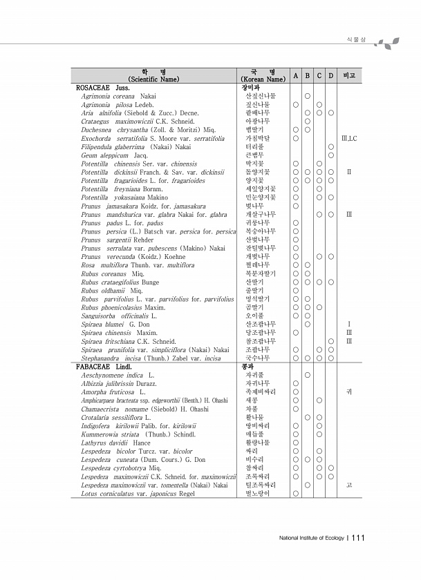 식 물 상 National Institute of EcologyⅠ111 학 명 Scientific Name 국 명 Korean Name A B C D 비고 ROSACEAE Juss. 장미과 Agrimonia coreana Nakai 산짚신나물 ○ Agrimonia pilosa Ledeb. 짚신나물 ○ ○ Aria alnifolia Siebold & Zucc. Decne. 팥배나무 ○ ○ ○ Crataegus maximowiczii C.K. Schneid. 아광나무 ○ Duchesnea chrysantha Zoll. & Moritzi Miq. 뱀딸기 ○ ○ Exochorda serratifolia S. Moore var. serratifolia 가침박달 ○ Ⅲ,LC Filipendula glaberrima N...