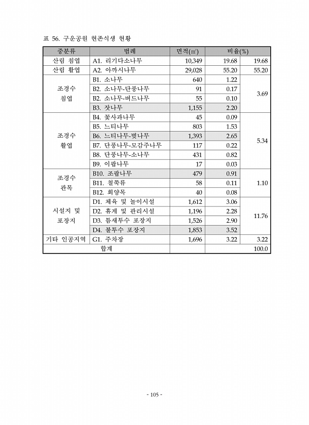 105 표 구운공원 현존식생 현황 중분류 범례 면적 비율 산림 침엽 리기다소나무 산림 활엽 아까시나무 조경수 침엽 소나무 소나무 단풍나무 소나무 버드나무 잣나무 조경수 활엽 꽃사과나무 느티나무 느티나무 벚나무 단풍나무 모감주나무 단풍나무 소나무 이팝나무 조경수 관목 조팝나무 철쭉류 회양목 시설지 및 포장지 체육 및 놀이시설 휴게 및 관리시설 틈새투수 포장지 불투수 포장지 기타 인공지역 주차장 합계 105