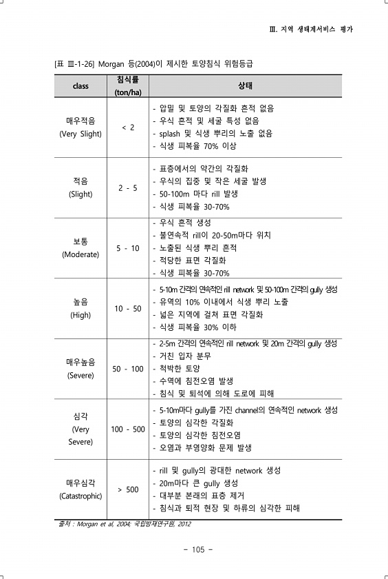Ⅲ. 지역 생태계서비스 평가 105 class 침식률 ton/ha 상태 매우적음 Very Slight 2 압밀 및 토양의 각질화 흔적 없음 우식 흔적 및 세굴 특성 없음 splash 및 식생 뿌리의 노출 없음 식생 피복율 70% 이상 적음 Slight 2 5 표층에서의 약간의 각질화 우식의 집중 및 작은 세굴 발생 50-100m 마다 rill 발생 식생 피복율 30-70% 보통 Moderate 5 10 우식 흔적 생성 불연속적 rill이 20-50m마다 위치 노출된 식생 뿌리 흔적 적당한 표면 각질화 식생 피복율 30-70% 높음 High 10 50 5-10m간격의연속적인rill network 및50-100m간격의gully 생성 유역의 10% 이내에서 식생 뿌리 노출 넓은 지역에 걸쳐 표면 각질화 식생 피복...