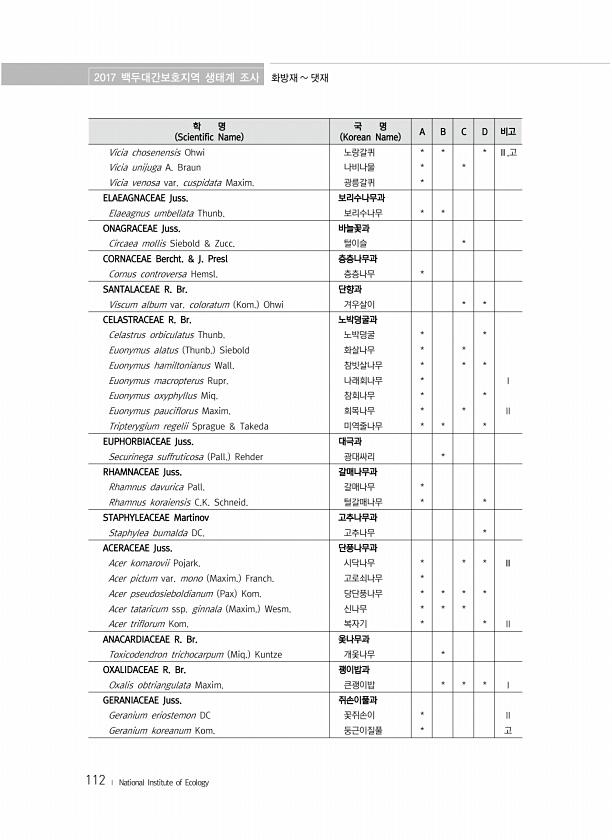 2017 백두대간보호지역 생태계 조사 화방재 댓재 112 ? National Institute of Ecology 학 명 Scientific Name 국 명 Korean Name A B C D 비고 Vicia chosenensis Ohwi 노랑갈퀴 * * * Ⅲ,고 Vicia unijuga A. Braun 나비나물 * * Vicia venosa var. cuspidata Maxim. 광릉갈퀴 * ELAEAGNACEAE Juss. 보리수나무과 Elaeagnus umbellata Thunb. 보리수나무 * * ONAGRACEAE Juss. 바늘꽃과 Circaea mollis Siebold & Zucc. 털이슬 * CORNACEAE Bercht. & J. Presl 층층나무과 Cornus controversa H...