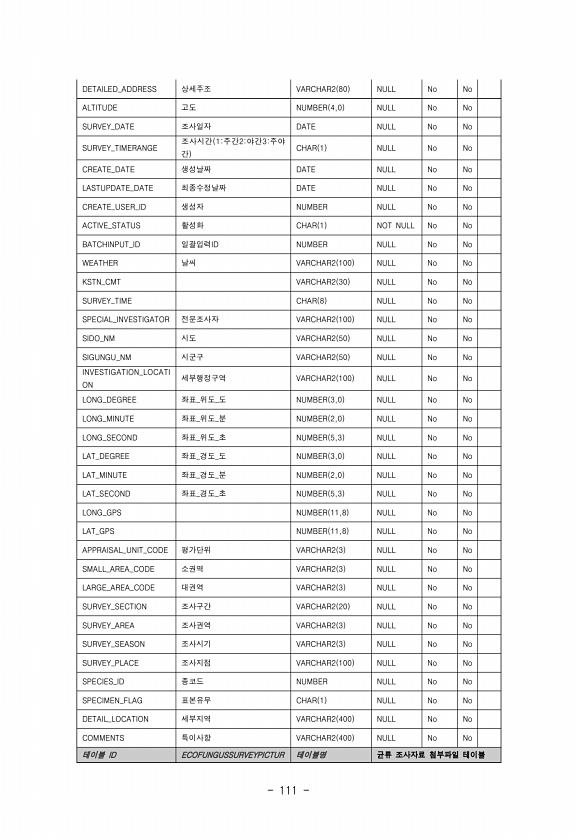 111 DETAILED_ADDRESS 상세주조 VARCHAR2 80 NULL No No ALTITUDE 고도 NUMBER 4,0 NULL No No SURVEY_DATE 조사일자 DATE NULL No No SURVEY_TIMERANGE 조사시간 1주간2야간3주야 간 CHAR 1 NULL No No CREATE_DATE 생성날짜 DATE NULL No No LASTUPDATE_DATE 최종수정날짜 DATE NULL No No CREATE_USER_ID 생성자 NUMBER NULL No No ACTIVE_STATUS 활성화 CHAR 1 NOT NULL No No BATCHINPUT_ID 일괄입력ID NUMBER NULL No No WEATHER 날씨 VARCHAR2 100 NULL No No KSTN_CMT ...