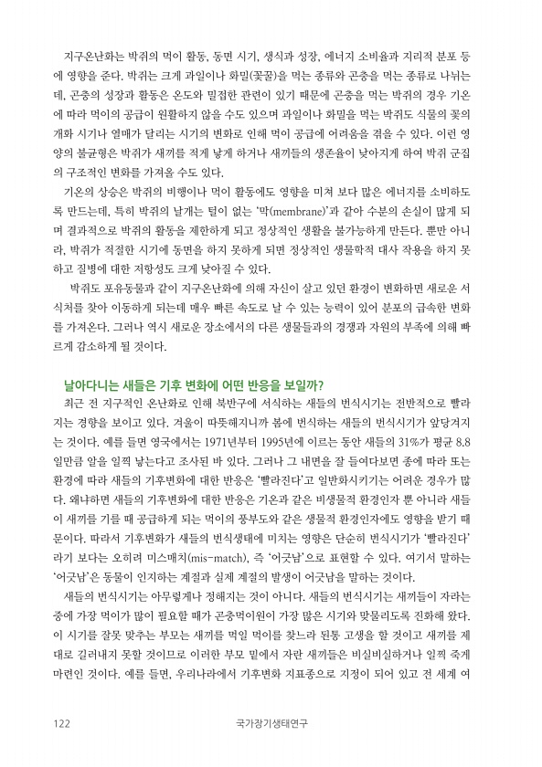 122 국가장기생태연구 지구온난화는 박쥐의 먹이 활동, 동면 시기, 생식과 성장, 에너지 소비율과 지리적 분포 등 에 영향을 준다. 박쥐는 크게 과일이나 화밀 꽃꿀 을 먹는 종류와 곤충을 먹는 종류로 나뉘는 데, 곤충의 성장과 활동은 온도와 밀접한 관련이 있기 때문에 곤충을 먹는 박쥐의 경우 기온 에 따라 먹이의 공급이 원활하지 않을 수도 있으며 과일이나 화밀을 먹는 박쥐도 식물의 꽃의 개화 시기나 열매가 달리는 시기의 변화로 인해 먹이 공급에 어려움을 겪을 수 있다. 이런 영 양의 불균형은 박쥐가 새끼를 적게 낳게 하거나 새끼들의 생존율이 낮아지게 하여 박쥐 군집 의 구조적인 변화를 가져올 수도 있다. 기온의 상승은 박쥐의 비행이나 먹이 활동에도 영향을 미쳐 보다 많은 에너지를 소비하도 록 만드는데, 특히...