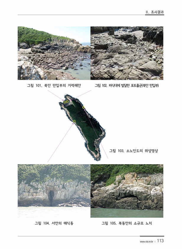 Ⅱ. 조사결과 www.nie.re.kr ? 113 그림 101. 북안 만입부의 거력해안 그림 102. 파식대에 발달한 포트홀군 북안 만입부 그림 103. 소노인도의 위성영상 그림 104. 서안의 해식동 그림 105. 북동안의 소규모노치