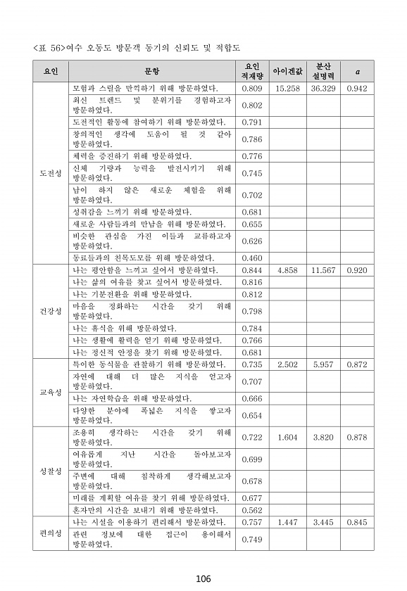 106 표 56 여수 오동도 방문객 동기의 신뢰도 및 적합도 요인 문항 요인 적재량 아이겐값 설명력 분산 α 도전성 모험과 스릴을 만끽하기 위해 방문하였다. 0.809 15.258 36.329 0.942 최신 트렌드 및 분위기를 경험하고자 방문하였다. 0.802 도전적인 활동에 참여하기 위해 방문하였다. 0.791 창의적인 생각에 도움이 될 것 같아 방문하였다. 0.786 체력을 증진하기 위해 방문하였다. 0.776 신체 기량과 능력을 발전시키기 위해 방문하였다. 0.745 남이 하지 않은 새로운 체험을 위해 방문하였다. 0.702 성취감을 느끼기 위해 방문하였다. 0.681 새로운 사람들과의 만남을 위해 방문하였다. 0.655 비슷한 관심을 가진 이들과 교류하고자 방문하였다. 0.626 동료들과의 친목도모...