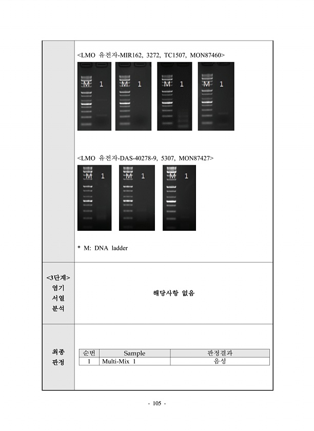 105 LMO 유전자-MIR162, 3272, TC1507, MON87460 LMO 유전자-DAS-40278-9, 5307, MON87427 * MDNA ladder 3단계 염기 서열 분석 해당사항 없음 최종 판정 순번 Sample 판정결과 1 Multi-Mix 1음성