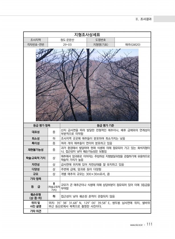 Ⅱ. 조사결과 www.nie.re.kr ? 111 지형조사상세표 조사지역 청도 운문산 도엽번호 격자번호-연번 29-03 지형명 기호 애추 GM20 등급 평가 항목 등급 평가 기준 대표성 중 산지 급사면을 따라 발달한 전형적인 애추이나, 배후 급애와의 연계성이 부분적으로 미약함 희소성 하 조사지역 곳곳에 애추들이 분포하여 희소가치는 낮음 특이성 중 여러 개의 애추들이 연이어 분포하고 있음 재현불가능성 중 과거 환경에서 발달하여 현재 식생에 의해 점유되어 가고 있는 화석지형이 나, 접근성이 낮아 훼손가능성은 보통임 학술?교육적 가치 상 애추에서 암괴류로 이어지는 주빙하성 지형발달과정을 관찰하기에 유용하므로 학술적 가치가 높음 자연성 상 급사면에 위치해 있어 자연상태를 잘 유지하고 있음 다양성 상 주변에 급애, ...