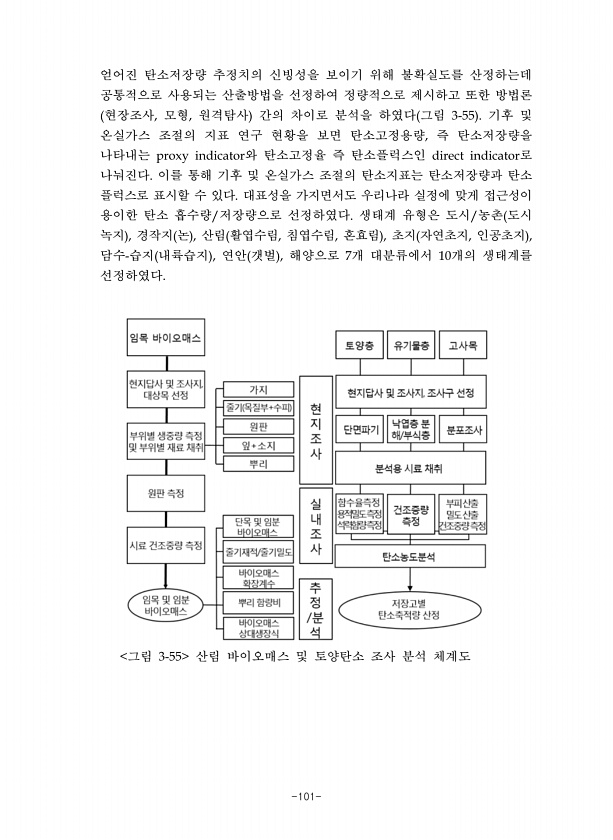 -101- 얻어진 탄소저장량 추정치의 신빙성을 보이기 위해 불확실도를 산정하는데 공통적으로 사용되는 산출방법을 선정하여 정량적으로 제시하고 또한 방법론 현장조사 모형 원격탐사 간의 차이로 분석을 하였다 그림 기후 및 온실가스 조절의 지표 연구 현황을 보면 탄소고정용량 즉 탄소저장량을 나타내는 와 탄소고정율 즉 탄소플럭스인 로 나눠진다 이를 통해 기후 및 온실가스 조절의 탄소지표는 탄소저장량과 탄소 플럭스로 표시할 수 있다 대표성을 가지면서도 우리나라 실정에 맞게 접근성이 용이한 탄소 흡수량 저장량으로 선정하였다 생태계 유형은 도시 농촌 도시 녹지 경작지 논 산림 활엽수림 침엽수림 혼효림 초지 자연초지 인공초지 담수 습지 내륙습지 연안 갯벌 해양으로 개 대분류에서 개의 생태계를 선정하였다 그림 산림 바이오매스...